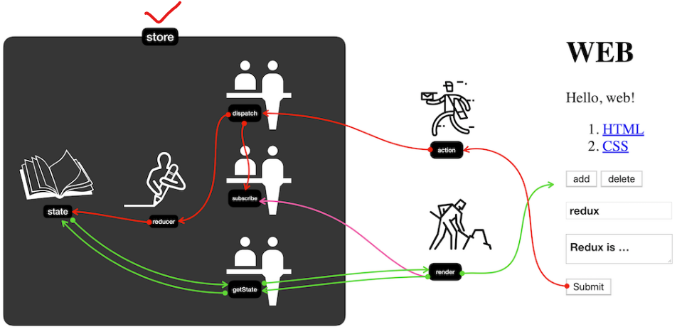 생활코딩의 리덕스 강의에서는 아래 그림을 이용하여 리덕스의 작동 방식을 설명한다.